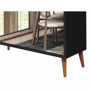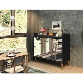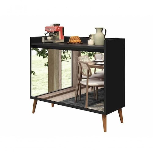 Buffet Aparador Retrô Com Espelho Delux 2 Portas Preto - Moveisaqui Ideal para organizar melhor sua sala de jantar ou de estar, o Buffet Aparador Retrô Delux 2 Portas - MoveisAqui trouxe de volta a pegada retrô que veio para ficar. Os pés estilo palito, levemente angulados, se destacam pelo charme que garante à peça. Seus compartimentos internos são ideais para armazenar e organizar diversos tipos de objetos pessoais, além de seu aparelho de jantar e demais itens que sejam necessários. Lindo, robusto e versátil, garante um espaço moderno e organizado.Dimensões do Produto Montado:Altura: 80 cmLargura: 90 cmProfundidade: 33 cmObservações:- Produzido em MDP;- 2 portas com dobradiças metálicas;- Portas com frente em espelho;- Pés palito, estilo retrô, em madeira pinus;- Peso suportado por prateleira: até 7kg;- Pintura Ultravioleta com acabamento fosco. Marca: Não Informado