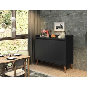 Buffet Aparador Retrô Delux 2 Portas Preto - Moveisaqui Ideal para organizar melhor sua sala de jantar ou de estar, o Buffet Aparador Retrô Delux 2 Portas - MoveisAqui trouxe de volta a pegada retrô que veio para ficar. Os pés estilo palito, levemente angulados, se destacam pelo charme que garante à peça. Seus compartimentos internos são ideais para armazenar e organizar diversos tipos de objetos pessoais, além de seu aparelho de jantar e demais itens que sejam necessários. Lindo, robusto e versátil, garante um espaço moderno e ões do Produto Montado:Altura: 80 cmLargura: 90 cmProfundidade: 33 cmObservações:- Produzido em MDP;- 2 portas com dobradiças metálicas;- Pés palito, estilo retrô, em madeira pinus;- Peso suportado por prateleira: até 7kg;- Pintura Ultravioleta com acabamento fosco. Marca: Não Informado
