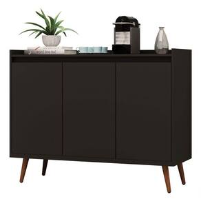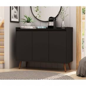 Buffet Aparador Retrô Delux 3 Portas Preto - Moveisaqui Ideal para organizar melhor sua sala de jantar ou de estar, o Buffet Aparador Retrô Delux 3 Portas - MoveisAqui trouxe de volta a pegada retrô que veio para ficar. Os pés estilo palito, levemente angulados, se destacam pelo charme que garante à peça. Seus compartimentos internos são ideais para armazenar e organizar diversos tipos de objetos pessoais, além de seu aparelho de jantar e demais itens que sejam necessários. Lindo, robusto e versátil, garante um espaço moderno e organizado.Dimensões do Produto Montado:Altura: 96 cmLargura: 120 cmProfundidade: 45 cmObservações:- Produzido em MDP;- 3 portas com dobradiças metálicas;- Pés palito, estilo retrô, em madeira pinus;- Peso suportado por prateleira: até 7kg;- Pintura Ultravioleta com acabamento semi brilho. Marca: Não Informado