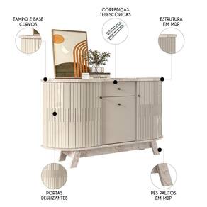 O Buffet Aparador Sala de Estar 135cm Toni Z10 Off/Calacata, da Mpozenato, une sofisticação e funcionalidade, sendo perfeito para sua Sala de Estar. Esse Buffet Aparador conta com 3 portas, sendo 1 com dobradiças metálicas e 2 deslizante, além de 1 gaveta com corrediças telescópicas para maior suavidade no uso. As prateleiras oferecem o espaço ideal para organização, enquanto o tampo e a base apresentam detalhes curvos, garantindo um acabamento sofisticado. Os pés palito e os puxadores em bronze completam o design moderno e elegante, combinado com as chapas de MDP para maior resistência. Esse Buffet Para Sala proporciona amplo espaço para utensílios e objetos decorativos, mantendo a estética clean e funcional. Adicione o Buffet ao seu carrinho agora e transforme sua Sala de Jantar com estilo! ESPECIFICAÇÕES Dimensões do ProdutoLargura: 136 cm. Altura: 81 cm. Profundidade: 35 cm. Peso: 34 Kg. Características do ProdutoMaterial da Estrutura: MDP/MDF. Espessura das Chapas: 15mm/ 25mm. Peso Suportado: 20 kg distribuídos. Acabamento: Pintura UV. Escala de Brilho: Brilho/Fosco. Possui Prateleiras: Sim. Quantidade de Prateleiras: 3 Prateleiras. Material da Prateleiras: MDP. Possui Portas: Sim. Quantidade de Portas: 3 Portas. Material da Porta: MDF. Tipo de Porta: Convencional/Deslizante. Possui Gavetas: Sim. Quantidade de Gavetas: 1 Gaveta. Tipo de Corrediças: Telescópicas. Possui Puxador: Sim. Material do Puxador: Poliestireno. Possui Nicho: Não. Possui Pés: Sim. Quantidade de Pés: 4 Pés. Material dos Pés: Madeira Maciça. Diferenciais:- Design moderno.- Corrediças telescópicas.