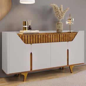 O Buffet Para Sala tem quatro portas equipadas com dobradiças metálicas com sistema de amortecimento, que proporcionam um fechamento suave e silencioso. Essa tecnologia agrega sofisticação e conforto no uso diário.