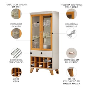 O conjunto de Cristaleira e Buffet combina elegância e praticidade. A Cristaleira possui duas portas de vidro emolduradas em MDF, prateleiras de vidro um fundo espelhado, ampliando e destacando suas taças e louças, além de um nicho adega para acomodar suas bebidas. Já o Buffet Aparador oferece duas portas com puxadores pontuais, duas gavetas com corrediças telescópicas, sendo uma menor e outra maior. O destaque fica por conta da bandeja em espelho sobre o tampo e um detalhe em vidro reflecta. Os pés em madeira maciça garantem resistência e estabilidade.