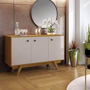 Perfeito para trazer a organização que falta na sua sala de jantar ou estar, o Buffet Retrô Harmonia é um complemento ideal pois reúne estilo e beleza. MDP 15mm, Portas com dobradiça de pressão, Pés em madeira maciça. Pesos e Dimensões Altura (cm): 78 cm Largura (cm): 120 cm Profundidade (cm): 38,5 cm Peso (kg): kg Materiais e Acabamentos Material Principal: MDP Material da Porta: MDP Acabamento: Pintura UV Escala de Brilho: Brilhante Material dos Pés: Madeira Maciça Acabamento da Porta: Pintura UV Escala de Brilho da Porta: Brilhante Tipo de Dobradiça/Corrediça da Porta: Metálica Acabamento da Prateleira: Pintura UV Escala de Brilho da Prateleira: Fosco Material da Prateleira: MDP Tipo de Madeira Maciça dos Pés: Eucalipto Montagem Necessita Montagem: Sim Complexidade da Montagem Baixa: pode ser montado por uma pessoa sozinha Sistema de Montagem: Parafusos e Minifix Recomendações de Uso, Manutenção e Limpeza Pano levemente úmido Características Tipo de Porta: Bater Marca: JCM Móveis Suporta Até (kg): 30 kg Possui Rodízio: Não Possui Pés: 04 Possui Gavetas: Não Possui Adega: Não Peso Máximo por Prateleira: 5 kg Linha ou Coleção: RETRÔ Estilo: Retrô Sapatas Niveladoras: Não Tipo de Puxador da Porta: Externo Possui Espelhos: Não Itens Inclusos Itens Inclusos: Buffet, Kit Ferragens e Manual de Montagem