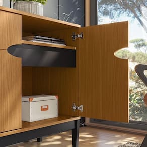 - Versatilidade: Pode ser utilizado como buffet na sala de jantar, aparador na sala de estar ou móvel organizador no espaço gourmet.