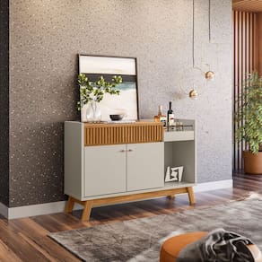 DETALHES QUE TORNAM ELE ÚNICO Com muito charme você pode exibir na parte superior suas decorações preferidas. Além de tudo, o Buffet Lucca dispõe de duas portas de abrir e uma gaveta corrediça telescópica com detalhe ripado para que você possa guardar com estilo aqueles objetos úteis do dia-a-dia. Em um produto tão moderno não podia faltar um local para colocar quadros ou drinques, não é? Por isso Buffet Lucca possui um bar espelhado com hastes metálicas, que vão manter sua sala ainda mais sofisticada.