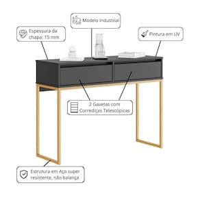 Feito em MDP com acabamento bordas em ABS. Estrutura em aço com pintura EPOXI nas cores preto.