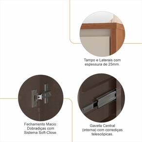 Tampo, laterais em MDP de 25mm, portas em MDF de 15mm com bordas arredondadas e laqueadas