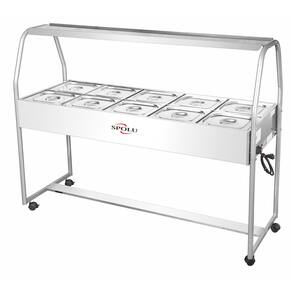 A função do Buffet térmico SPOLU é manter os alimentos servidos em suas cubas quentes enquanto em exposição. Possui cubas fabricadas em aço inox 201, tanque, tampas e moldura externa em aço inox 430 e estrutura de sustentação tubular. Sua resistência blindada é confeccionada em aço inox e controlada por um termostato com escala de 30ºC a 120ºC. Possui uma lâmpada piloto em seu painel indicando a função liga/desliga do termostato. Para facilitar a movimentação e o deslocamento a estrutura tubular é dotada de rodízios giratórios. Produtos SPOLU - CONCEITO DE QUALIDADE.