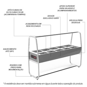 Com o Buffet Térmico Aquecido SARO será mais fácil servir diversos tipos de alimentos e mantê-los na temperatura certa enquanto expostos para agradar seus clientes. Este produto é indispensável para restaurantes, hotéis, lanchonetes, padarias, eventos, e similares que procuram por um produto econômico com excelente custo-benefício.