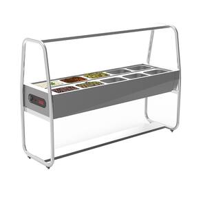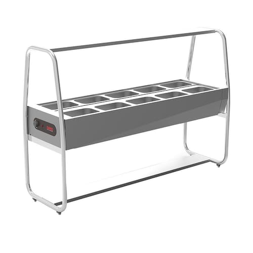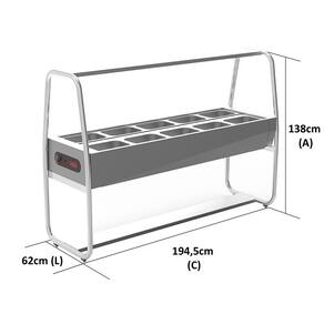 Esse Buffet tem aquecimento de até 120C, acabamento em aço escovado, válvula para deságue e um design exclusivo que vai encantar seus clientes. Além disso, ele conta com um apoio superior perfeito para saladas e acompanhamentos, oferecendo uma apresentação impecável.