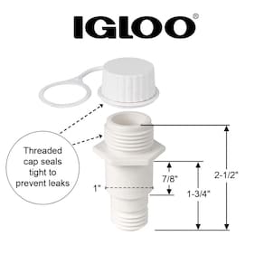 - Cabe em coolers Igloo com um orifício de drenagem de aproximadamente 2,5 cm de diâmetro externo e espessura de parede térmica de aproximadamente 3,5 cm.