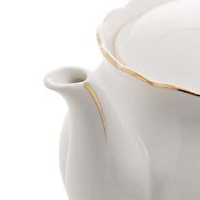 O bule em um branco atemporal, exibe um acabamento refinado em porcelana, adicionando um toque de sofisticação à sua mesa.