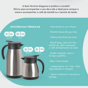 Graças ao seu isolamento a vácuo e parede dupla de aço inox , o Bule Elegance mantém líquidos quentes por até 6 horas e bebidas frias por até 10 horas , preservando sabor e frescor por muito mais tempo.