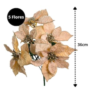-01 Unidade Bouquet de Bico-de-Papagaio Natalino em Veludo Champanhe - 5 Flores Luxo com Borda em Glitter, 36cm