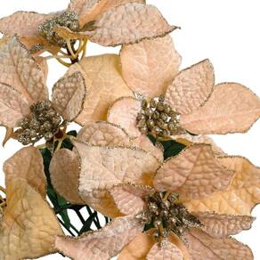 Adicione sofisticação e brilho à sua decoração natalina com este bouquet de bico-de-papagaio em veludo na elegante cor champanhe. Com 5 flores e detalhes delicados em glitter nas bordas, ele traz um toque de luxo e elegância. Perfeito para centros de mesa, guirlandas ou como complemento de arranjos festivos.