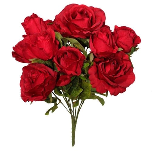 Características do produto Comprimento: 45 cm de altura Flor artificial disponível na cor vermelha Buque de rosas revestido de folhas verdes Produto importado Este buquê apresenta 10 flores de rosa, sendo 5 abertas e 5 semi abertas (botões). Material: Poliéster de alta qualidade, plástico, arame As hastes possuem um fino arame para que possa assumir a posição que você desejar Produto pode sofrer ligeira mudança de tonalidade