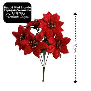 Transforme sua decoração de Natal com o charme clássico do Buquê Natalino Mini Bico de Papagaio em Veludo Vermelho. Com 5 flores em tecido de veludo com acabamento aveludado e rico em detalhes, este buquê oferece elegância e sofisticação para composições natalinas.