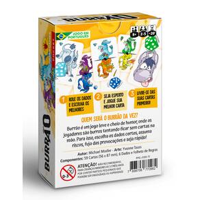 Burrão é um jogo leve e cheio de humor, onde os jogadores são burros tentando ficar sem cartas na mão. Para isso, escolha os dados certos, assuma riscos, fuja das provocações e seja rápido! Role os dados e decida como posicioná-los. Depois, escolha com cuidado qual carta jogar – se escolher mal, pode acabar com a maior carta da rodada e quem terminar com ela leva o título de Burrão! Rápido de aprender e cheio de reviravoltas, Burrão garante risadas e muita diversão! Um jogo perfeito para família e amigos, em partidas curtas e barulhentas. Quem será o Burrão da vez?