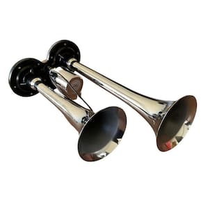 Par de buzinas automotivas eletropneumáticas com cornetas cromadas bivolt 12/24v eleve a potência e o impacto da buzina do seu caminhão com esse par de buzinas cromadas. Ela possui duas cornetas fabricadas em metal resistente e acabamento em cromo espelhado, ideal para uso externo.