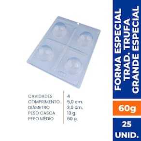 Qtde. Master: 25 Cavidade: 4 Diâmetro: 50 mm x Altura: 30 mm Peso casca: 13 g Peso médio: 60 g Modelo: Especial (3 Partes)