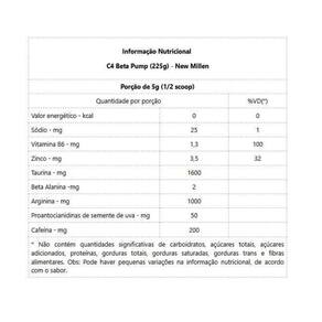 C4 Beta Pump 225g - Sabor: Açaí com Guaraná C4 Beta Pump 225g O C4 Beta Pump é um pré-treino altamente concentrado e que prepara seu organismo para um trabalho intenso e desgastante. A suplementação de beta-alanina é efetiva no aumento da concentração de carnosina no músculo, aumentando pH e retardando a fadiga. Além disso possui a Vitamina B6, que auxilia no funcionamento do seu organismo. Altamente concentrado, O C4 Beta Pump prepara o organismo do atleta para um trabalho intenso de desgaste. Ele apresenta, em sua fórmula, cafeína e outras substâncias com grande poder e energético, o que o torna o pré-treino mais poderoso do mercado. Além disso, O C4 Beta Pump foi escolhido na categoria nacional como melhor pré-treino do mercado, dessa forma ganhando o Prêmio Suplementação 2018. A New Millen foi escolhida, com o C4 Beta Pump, como a melhor opção do mercado nacional na categoria pré-treino pela terceira vez. O Prêmio Suplementação 2018 contou com 11 categorias, que foram decididas pelo voto popular e apresentadas na feira Brasil Trading Fitness Fair, em . benefícios: - Suplemento Pré-Treino em Pó;- Mais Energia e Disposição;- Fórmula Extra Pump Ação Vasodilatadora ;- 200mg de Cafeína por Porção;- Zero Glúten;- Aumenta o volume muscular. Marca: Não Informado Ean: 7896278900363