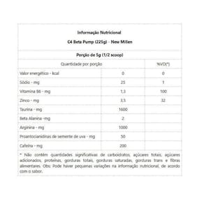 C4 Beta Pump 225g - Sabor: Maçã Verde. C4 Beta Pump 225g O C4 Beta Pump é um pré-treino altamente concentrado e que prepara seu organismo para um trabalho intenso e desgastante. A suplementação de beta-alanina é efetiva no aumento da concentração de carnosina no músculo, aumentando pH e retardando a fadiga. Além disso possui a Vitamina B6, que auxilia no funcionamento do seu organismo. Altamente concentrado, O C4 Beta Pump prepara o organismo do atleta para um trabalho intenso de desgaste. Ele apresenta, em sua fórmula, cafeína e outras substâncias com grande poder e energético, o que o torna o pré-treino mais poderoso do mercado. Além disso, O C4 Beta Pump foi escolhido na categoria nacional como melhor pré-treino do mercado, dessa forma ganhando o Prêmio Suplementação 2018. A New Millen foi escolhida, com o C4 Beta Pump, como a melhor opção do mercado nacional na categoria pré-treino pela terceira vez. O Prêmio Suplementação 2018 contou com 11 categorias, que foram decididas pelo voto popular e apresentadas na feira Brasil Trading Fitness Fair, em . benefícios: - Suplemento Pré-Treino em Pó;- Mais Energia e Disposição;- Fórmula Extra Pump Ação Vasodilatadora ;- 200mg de Cafeína por Porção;- Zero Glúten;- Aumenta o volume muscular. Marca: Não Informado Ean: 7896278900349