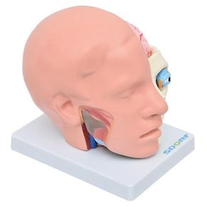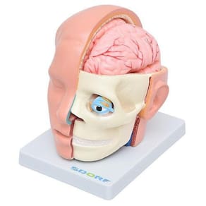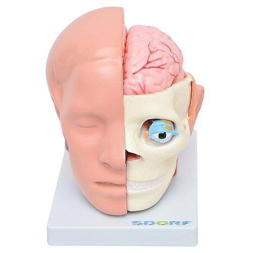 Modelo anatômico de cabeça em 10 partes com cérebro; o modelo anatômico é confeccionado em PVC e resina plástica emborrachada; Este modelo possibilita duas visões da mesma peça anatômica, sendo: Uma visão da anatomia com cútis do crânio e face, e outra visão estrutural da anatomia do crânio, face e órgãos.