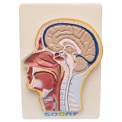 Modelo anatômico de secção mediana da cabeça, confeccionado em PVC; Este modelo anatômico oferece com riqueza de detalhes as estruturas presentes na cabeça.
