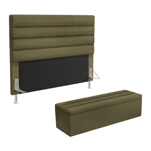 O Kit Cabeceira Atlas foi inspirada para você, ela possui um design clássico, perfeita para seu espaço, possui também detalhes modernos na horizontal e um ótimo acabamento, tudo isso com ótimo custo benefício. Possui dois pés de 12 cm e fixação via frames para a sustentação do box, não sendo necessário furar a sua cama, apenas encaixa-la nos suportes da cabeceira. Junto com a Calçadeira Ursa que possui uma ótima capacidade de armazenamento interno, podendo armazenar cobertores, almofadas, entre outros. Adquira já! Dimensões da CabeceiraLargura: 160 cmAltura: 127 cmProfundidade: 10 cmPeso: 20 KgDimensões da CalçadeiraLargura: 160 cmAltura: 45 cmProfundidade: 46 cmPeso: 20 KgDimensões do Produto embaladoVolume 1Largura: 162 cmAltura: 129 cmProfundidade: 12 cmPeso: 22 kgVolume 2Largura: 162 cmAltura: 47 cmProfundidade: 48 cmPeso: 22 kgCaracterísticas do Produto:Madeira de eucalipto proveniente de reflorestamentoFixação com grampos galvanizadosEspuma Poliuretano D20Revestimento: Veludo Cor: CapuccinoTamanho: Queen para cama box de 158 cmPossui pés: SimTipo de pés: 2 pés PVC de 12 cm e 4 sapatasEmbalagem: plástico bolha, papelão ondulado, malha, plásticoFixação diretamente no box através de framesGarantia de 3 meses contra defeitos de fábrica.Diferenciais: - Madeira de alta qualidade- Design moderno- Material resistente- Ótimo acabamento- Estrutura reforçadaSistema de Montagem: O produto é enviado montado, sendo necessário apenas a fixação dos frames e pés.Manual de Montagem: SimVolume: 2 VolumesMontagem: Recomendamos que seja feita por um profissionalRecomendação de Limpeza: Utilize pano levemente úmidoObservações importantes- Produto para uso residencial em ambiente interno, não devendo ficar exposto diretamente ao sol, calor e umidades excessivas.- Pode haver alguma diferença de tonalidade entre a imagem e o produto real, por conta do tratamento de imagens e a calibração de cores do seu monitor.- As imagens são meramente ilustrativas, não acompanham objetos de decoração e eletrônicos.
