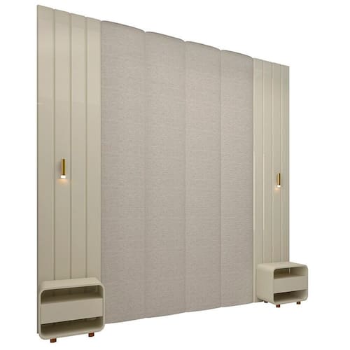O Conjunto Cabeceira Magnífica foi criado para transformar o quarto em um ambiente sofisticado, funcional e acolhedor. Composto por uma elegante cabeceira com tecido em Linho claro, dois painéis Majestade que valorizam a composição, duas mesas de cabeceira Innova com corrediças telescópicas que garantem suavidade e praticidade no uso diário, além de um kit com duas luminárias integradas ao painel, o conjunto oferece conforto, organização e um toque de modernidade. Ideal para quem busca design, aconchego e funcionalidade em cada detalhe. Produto Montado: Sim Acabamento da Mesa de Cabeceira: Pintura Acabamento dos Pés: Pintura Altura dos Pés: 5 cm Altura Máxima dos Pés: 5.0000 Ambiente Principal: Quarto Cabeceira Estofada: Sim codigo_ean: 7900288332219 Complexidade da Montagem: Média: pode ser montado por mais de uma pessoa e/ou necessite de maior conhecimento para montagem Cor: Natural Claro/Off White Cor do Produto: Natural Claro/Off White Cor Flex: Não Densidade da Espuma: D-28 Escala de Brilho: Fosco Escala de Brilho da Mesa de Cabeceira: Brilhante Extensível: Não Fixação Box: Não Fixação na Parede: Sim Informações Complementares: Acompanha 2 Placas Ripadas 046 Majestade + 02 Luminárias. Itens Inclusos: 1 Cabeceira, 2 Mesas de Cabeceira, Kit Ferragens e Manual de Montagem Largura do Colchão Indicado: 193cm Linha ou Coleção: Magnífica/Innova/Majestade Manual de Especificação Técnica: https://product-hub-prd.madeiramadeira.com.br/899776804/documents/47e9ce46-66e2-455e-a9b5-8de23fdf1eee339669855017713340154923.pdf Manual de Montagem e Instalação: https://product-hub-prd.madeiramadeira.com.br/899776804/documents/2dddc2c9-e5cc-44c1-861e-aee51041a617339669755017713340131327.pdf Marca: Gelius Móveis Material da Mesa de Cabeceira: MDF Material dos Pés: Madeira Maciça Material Principal: MDF Montagem Flex: Não Necessita Montagem: Sim Origem do Produto: Nacional Peso: 126 kg Possui Baú: Não Possui Espelho: Não Possui LED: Não Possui Mesa de Cabeceira: 02 Possui Pés: 08 Possui Rodízio: Não Possui Possui Vidro: Não Recomendações de Uso, Manutenção e Limpeza: A limpeza do produto deve ser feita por meio do uso de um pano, umedecido com água, e um pano seco. É importante para fazer a limpeza do móvel nunca utilizar produtos químicos ou abrasivos. Para conservar o padrão de qualidade dos produtos Gelius, nunca arraste um móvel se este estiver cheio. Nunca puxe o móvel de frente para você, pois ele pode balançar e provocar acidentes. Sapatas Niveladoras: Não Sistema de Montagem: Convencional: parafusos, pregos, cavilhas, etc. Tipo de Colchão: Queen Tipo de Madeira Maciça dos Pés: Pinus