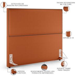 Produzida com materiais de excelente qualidade e acabamento impecável, o revestimento em Tecido Terracota combina majestosamente com as tachas decorativas. Pode ser disposta com mesas de cabeceira e apoio, calçadeira ou recamier, valoriza seu ambiente e cria um match perfeito em qualquer composição.