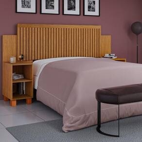 Com painel ripado e pés em madeira na cor natural, o conjunto oferece um visual elegante e versátil, acompanhado de 2 mesas de cabeceira com nichos que facilitam o armazenamento de livros, luminárias e objetos de uso diário.