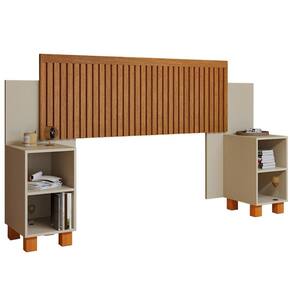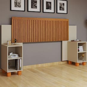 Com painel ripado e pés em madeira na cor natural, o conjunto oferece um visual elegante e versátil, acompanhado de 2 mesas de cabeceira com nichos que facilitam o armazenamento de livros, luminárias e objetos de uso diário.