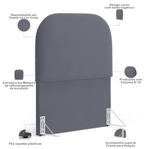 Características da Cabeceira: Estrutura em madeira de reflorestamento de eucalipto. Revestimento em tecido Suede de alta qualidade na cor Cinza. Estofamento com espuma D-18 para maior conforto e maciez. Design curvo, estilo orgânico. Pés sapatas plásticas.