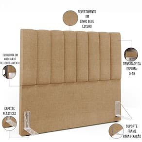 Cabeceira Cama Box Casal 140 Cm Dália W01 Linho Bege Escuro - Lyam Decor A Cabeceira Para Cama Box Dália é uma peça que traz graciosidade ao quarto. Além de dar um toque clássico, ela traz conforto e deixa o ambiente mais moderno e atrativo. Você pode deixar o quarto mais bonito e funcional compondo ela com uma mesinha de cabeceira, ou uma mesa de apoio ao lado da cama. Detalhes que fazem a diferença! Seus momentos de descansar serão mais agradáveis com um móvel incrível igual a esse em seu quarto. Garanta já á sua! Dimensões da Cabeceira (L x A x P) 140 x 120 x 8 cm Dimensões do Frame (L x A x P) 5,5 x 13,5 x 16,5 cm Características da Cabeceira: Estrutura em madeira . Revestimento em tecido Linho Bege Escuro. Densidade da Espuma D-18. Acompanha todos os acessórios para fixação. Acompanha suporte frame produzido em chapa de ferro com acabamento em esmalte PU na cor alumínio. Possui sapatas plásticas. Características do Frame: Produzido em chapa de ferro 1,5 mm. Acabamento em esmalte PU na cor Alumínio. Acessórios para fixação: 04 Parafs cabeça chata auto atarraxantes 5,0x25mm e 04 arruelas 1/4. - Por se tratar de estofado as medidas podem ter uma pequena variação de até 3 cm. - A tonalidade do produto real poderá ter ligeira variação devido o lote de tecidos. Observações importantes: - Produto para residencial em ambiente interno, não devendo ficar exposto diretamente ao sol, calor e umidade excessivos. - Pode haver alguma diferença de tonalidade entre a imagem e o produto real, por conta do tratamento de imagens e a calibração de cores do seu monitor. - As imagens são meramente ilustrativas, não acompanham objetos de decoração e eletrônicos. - Ao receber a mercadoria, o cliente deve verificar as condições da embalagem, caso haja alguma não assine o comprovante de recebimento. - Montagem, desmontagem e outras instalações serão de responsabilidade do cliente. Não nos responsabilizamos, no ato da , por subir escadas/elevadores ou pelo transporte por guincho em apartamentos. Eventuais despesas são de responsabilidade do comprador. - Confira as dimensões do produto e certifique-se de que passará normalmente por supostos elevadores, portas, escadas e/ou corredores de sua residência. NA