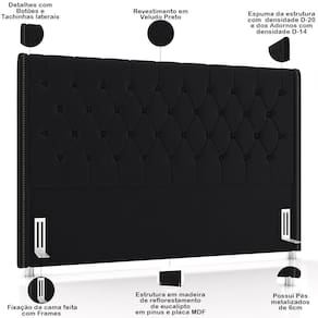 Com um design atemporal e sofisticado, essa cabeceira conta com detalhes que agregam muito mais charme como, por exemplo, o padrão dos adornos em botonê e as tachinhas laterais que emolduram a beleza dessa peça, ou seja, uma cabeceira para cama box que vai transformar seu quarto casal em um espaço luxuoso e aconchegante. Mas não somente de beleza se faz uma cabeceira, por isso, garantimos a qualidade, uma vez que é confeccionada com madeira de reflorestamento, além de receber tratamento contra mofo e cupins, para que você tenha um mobiliário durável e resistente. Para completar, os pés metalizados adicionam um charme extra e, ainda, evita o direto com o chão e umidade. Demais não é mesmo?!