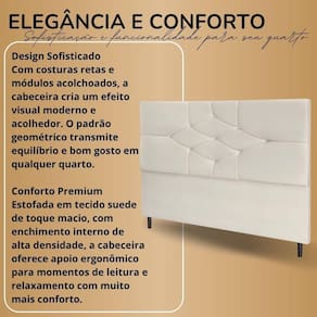Essa cabeceira se destaca pelo seu design moderno e ao mesmo tempo sofisticado, ideal para transformar o quarto em um ambiente mais aconchegante e refinado. Revestida em tecido suede, ela oferece um toque macio e agradável, além de excelente durabilidade e facilidade de limpeza.