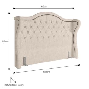 A estrutura é em madeira de eucalipto e forro em Kami TNT que garantem qualidade e resistência. Possui design Provençal, botões de cristal, um par de frames que auxiliam na instalação da cama e tachinhas que acompanham desde a borda do formato desta Cabeceira Capitonê até as laterais estofadas, agregando elegância ao produto.