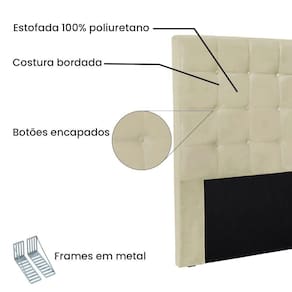 Dormir bem e manter-se seguro na hora de relaxar são fatores importantes que influenciam na qualidade do sono. Unir esses pontos com uma decoração incrível seria perfeito, não é mesmo? Que tal começar essa mudança pela cabeceira da sua cama!? A Cabeceira Verona sem dúvida vai roubar a cena de tão linda e aconchegante! Contém estrutura feita em madeira de eucalipto, uma opção que ressalta a durabilidade e beleza da peça. A cabeceira é preenchida com espuma D23, garantindo um conforto ideal para noites mais tranquilas. Este modelo é indicado para Cama Box King 195 cm, possui costura quadriculada e Botões encapados que conferem uma textura maleável e um visual refinado. O revestimento foi feito no Veludo, um tecido de alta qualidade no tom Bege perfeita para criar uma atmosfera mais aconchegante ao local. As sapata são de plástico além de serem muito resistentes garantem maior flexibilidade e sustentação à peça. E não menos importante acompanha frame em metal que é o suporte ideal para fixar a cabeceira na cama box. O design desta peça apresenta um elemento estético sofisticado, que transformará instantaneamente o ambiente e impedirá que a passagem de temperaturas (frio/quente) que se concentram na parede, passem diretamente para o usuário. A Cabeceira Verona é a opção mais adequada para o seu dormitório, afinal de contas você merece o que há de melhor para completar a decoração da sua casa. Adquira a Cabeceira Verona antes que acabe o estoque!