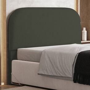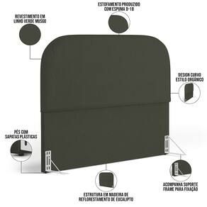 Características da Cabeceira: Estrutura em madeira de reflorestamento de eucalipto. Revestimento em Linho na cor Verde Musgo. Estofamento com espuma D-18 para maior conforto e maciez. Design curvo, estilo orgânico. Pés sapatas plásticas.