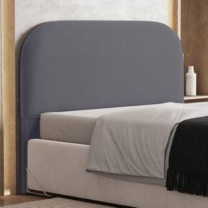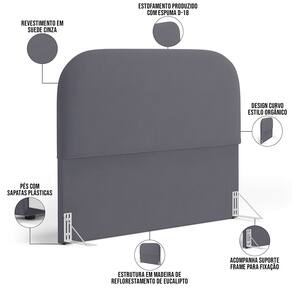 Características da Cabeceira: Estrutura em madeira de reflorestamento de eucalipto. Revestimento em Suede na cor Cinza Estofamento com espuma D-18 para maior conforto e maciez. Design curvo, estilo orgânico. Pés sapatas plásticas.
