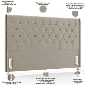 Com um design atemporal e sofisticado, essa cabeceira conta com detalhes que agregam muito mais charme como, por exemplo, o padrão dos adornos em botonê e as tachinhas laterais que emolduram a beleza dessa peça, ou seja, uma cabeceira para cama box que vai transformar seu quarto casal em um espaço luxuoso e aconchegante. Mas não somente de beleza se faz uma cabeceira, por isso, garantimos a qualidade, uma vez que é confeccionada com madeira de reflorestamento, além de receber tratamento contra mofo e cupins, para que você tenha um mobiliário durável e resistente. Para completar, os pés metalizados adicionam um charme extra e, ainda, evita o contato direto com o chão e umidade. Demais não é mesmo?!