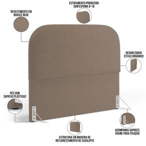 Características da Cabeceira: Estrutura em madeira de reflorestamento de eucalipto. Revestimento em Bouclê na cor Bege. Estofamento com espuma D-18 para maior conforto e maciez. Design curvo, estilo orgânico. Pés sapatas plásticas.