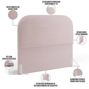 Características da Cabeceira: Estrutura em madeira de reflorestamento de eucalipto. Revestimento em Bouclê na cor Rosê. Estofamento com espuma D-18 para maior conforto e maciez. Design curvo, estilo orgânico. Pés sapatas plásticas.