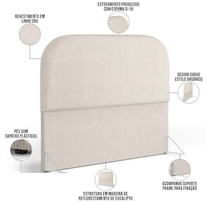 Características da Cabeceira: Estrutura em madeira de reflorestamento de eucalipto. Revestimento em Linho na cor Cru. Estofamento com espuma D-18 para maior conforto e maciez. Design curvo, estilo orgânico. Pés sapatas plásticas.