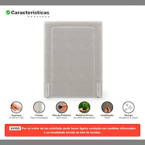 Fabricada com estrutura em madeira de eucalipto de reflorestamento e espumas D-20 e D-23, proporciona conforto, resistência e excelente custo-benefício. Conta com sapatas plásticas e acompanha frame adaptador para fácil fixação diretamente no box, dispensando o uso de furadeira ou fixações na parede.