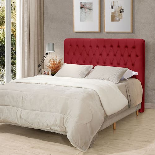 Características do produto: Tipo: Cabeceira Modelo: Inca Cor: Vermelho Tecido: Veludo Design estofado com toque suave e acabamento em tecido; Estilo capitonê (técnica de estofamento) que traz charme e elegância ao ambiente; Estrutura resistente com pés e suportes metálicos de fixação para cama box; Fabricada em madeira reflorestada e MDF; Fácil instalação, com suporte para encaixe e fixação segura;