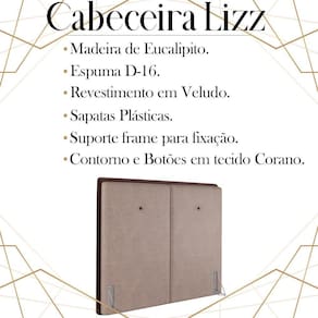 Cabeceira Casal 138 cm Lizz Veludo, é a escolha certa para você que busca conforto e modernidade, tornando o seu quarto muito mais versátil e sofisticado. Estrutura em madeira de eucalipto, que oferece maior durabilidade ao produto. Composta por revestimento em tecido veludo, contorno e botões em tecido corano, conta com espuma D-16 de altíssima qualidade, sapatas plásticas e acompanha frames para facilitar a fixação no box, é ideal para colchão Casal de 138 cm. Com design que proporciona elegância, charme e luxuosidade ao seu quarto. Este móvel chegará na sua casa separado em 01 volume.