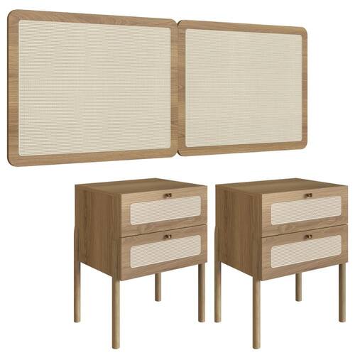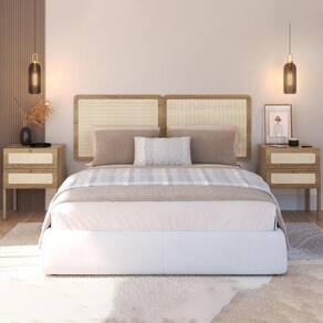 Cabeceira e 2 Mesas de Cabeceira 27978, o conjunto ideal para deixar seu quarto mais elegante. Produzido em madeira maciça Eucalipto e MDP 15 mm com acabamento BP. As mesas contam com gavetas com corrediças metálicas, puxadores em poliestireno dourado e detalhes em tela sintética (PVC) imitando palhinha, também presentes na cabeceira. Possui ainda sapatas emborrachadas que evitam atrito com o piso. Atende aos padrões Casal e Queen Size. Produto entregue em 5 volumes.