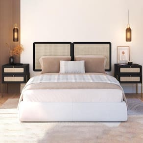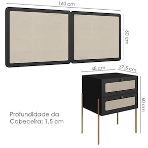 Cabeceira e 2 Mesas de Cabeceira 28978, o conjunto ideal para deixar seu quarto mais elegante. Produzido em tubo metálico em aço com pintura epóxi dourada e MDP 15 mm com acabamento BP. As mesas possuem gavetas com corrediças metálicas, puxadores em poliestireno dourado e detalhes em tela sintética (PVC) imitando palhinha, também presentes na cabeceira. Conta ainda com ponteiras plásticas que evitam atrito com o piso. Atende aos padrões Casal e Queen Size. Produto entregue em 5 volumes.